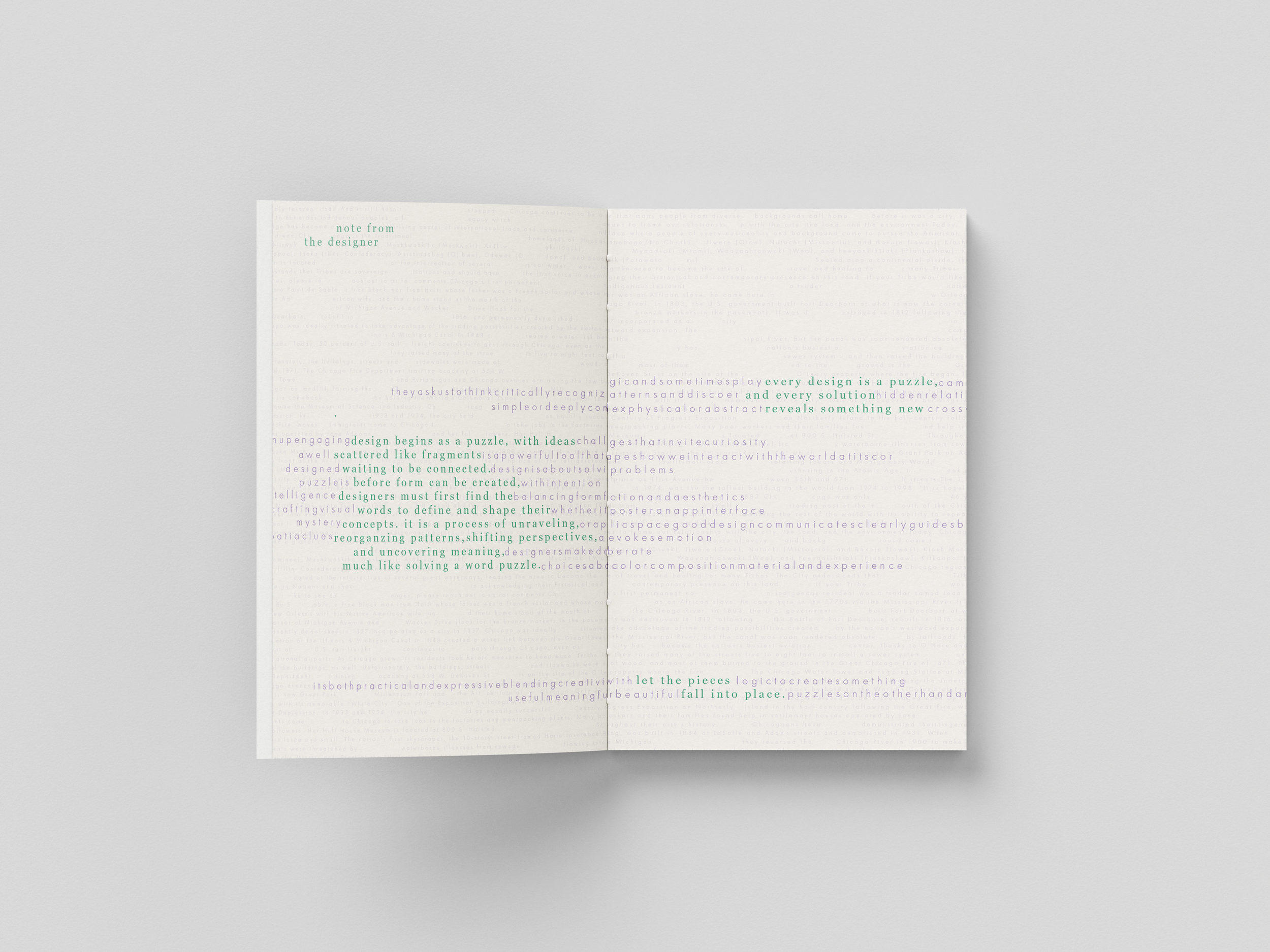 his project sees design as a process of solving, where ideas begin scattered like a word puzzle. By shifting perspectives and organizing fragments, meaning takes shape. The design visualizes this journey using layered text, shifting grids, and fragmented layouts to mirror the act of piecing thoughts together.